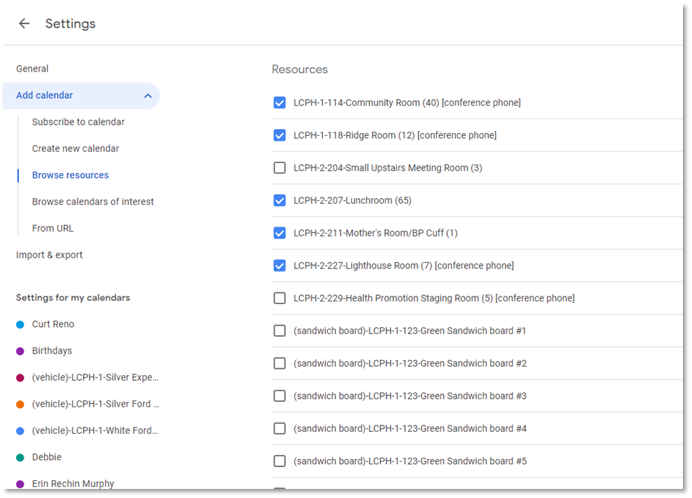 Figure: Browse resource screen, click on the resources you would like in calendar list