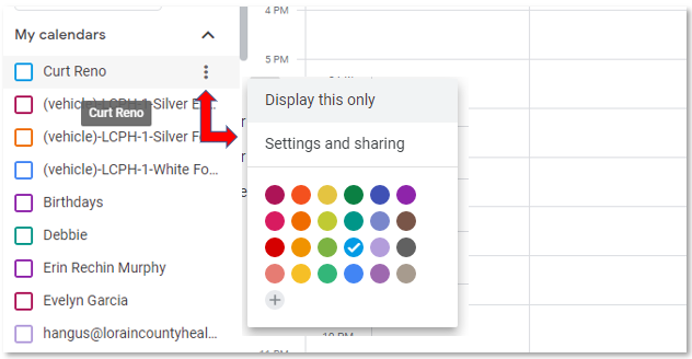 In the My calendars list on the left, click the three-dot icon next to your calendar, and then select Settings and Sharing