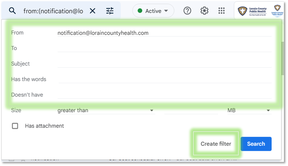 Add any additional information. Besides blocking from a specific email address, you can also choose to filter by recipient, subject line, key words, attachment size and more. Once you are finished customizing the filter, click "Create filter with this search".