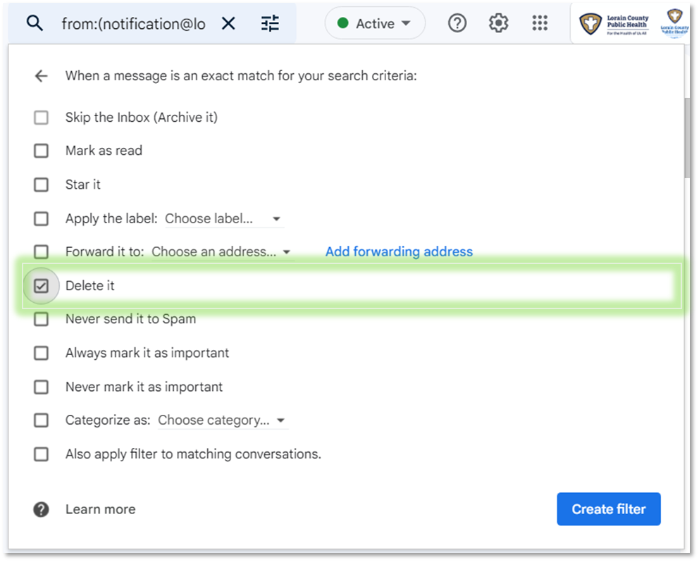 Set the filter to delete matching emails. On the next screen of the filter window, you can choose what happens with any emails that match the filter. If you want to block the email address, check the "Delete it" box. This will keep the email from appearing in your inbox and immediately delete it.